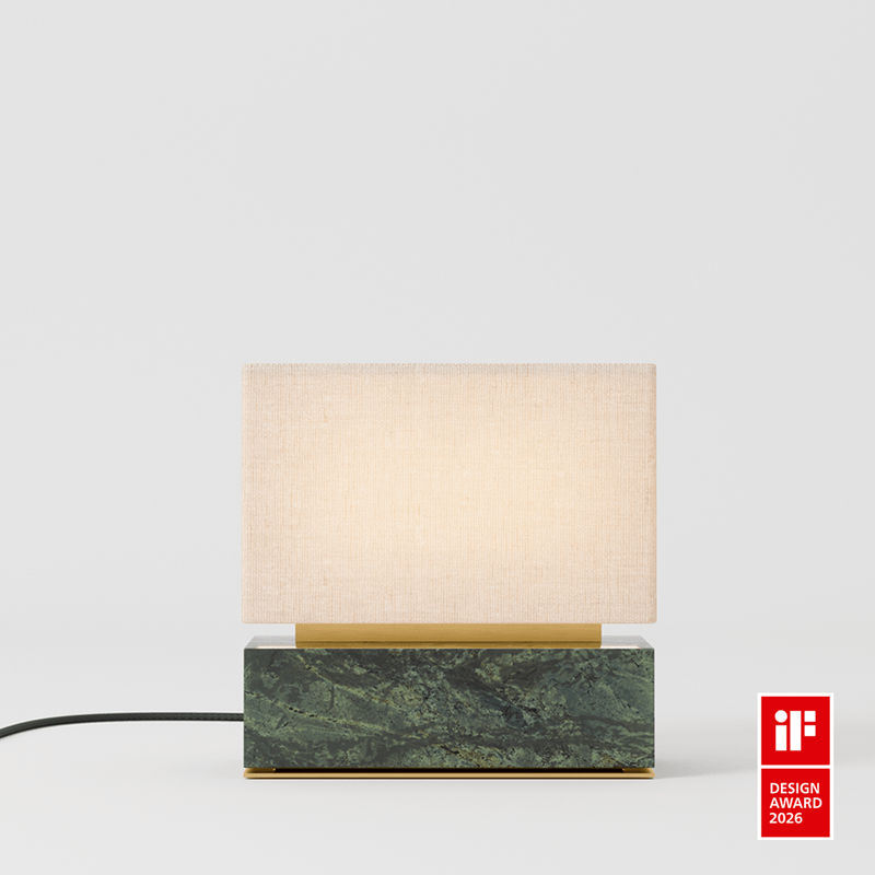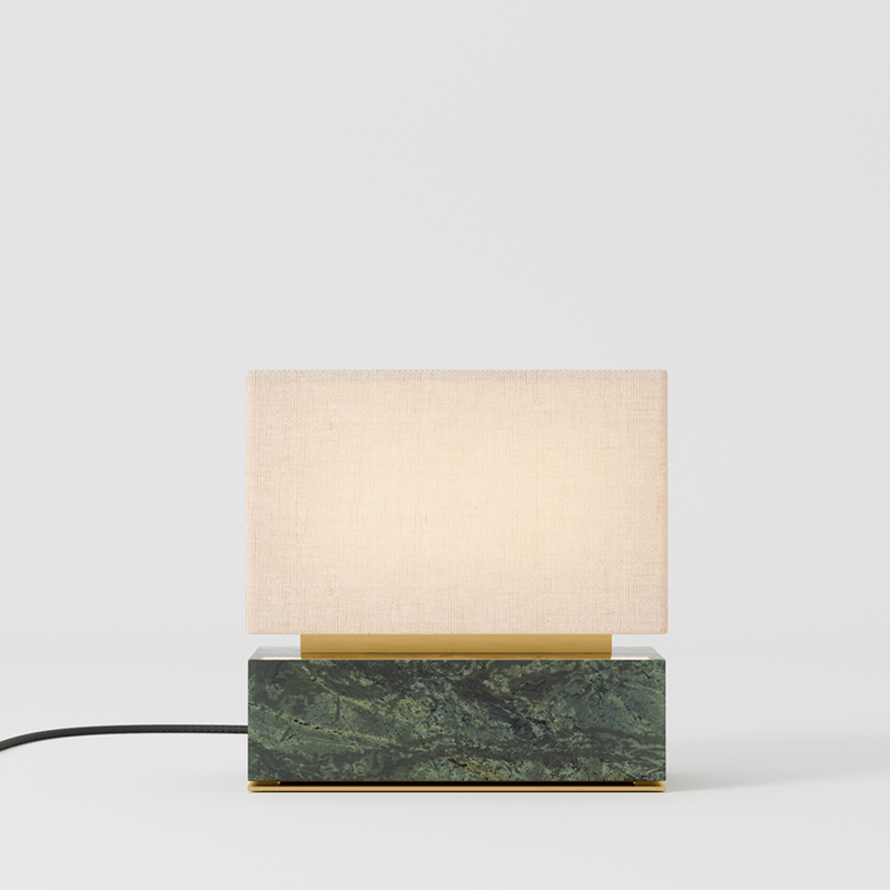 a luminária de mesa bolo 2 t possui opções de base em concreto e mármore verde, com cúpula em linho natural. possui detalhes em latão em sua haste e base. o modelo proporciona uma luz suave, difusa e aconchegante.