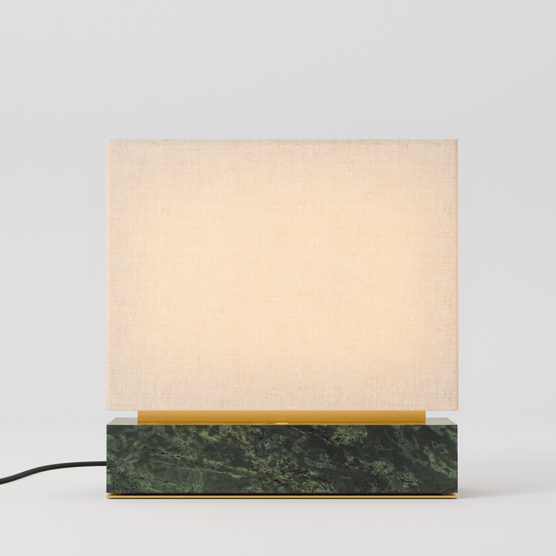 a luminária de mesa bolo 4 t possui opções de base em concreto, mármore verde e madeira, com cúpula em linho natural. possui detalhes em latão em sua haste e base. o modelo proporciona uma luz suave, difusa e aconchegante.