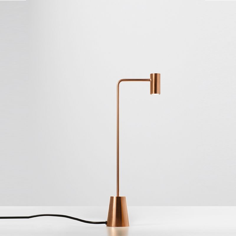 com desenho discreto e módulo led para iluminação pontual, a luminária de mesa less em cobre possibilita o movimento do facho de luz. é ideal para compor vários tipos de ambiente.