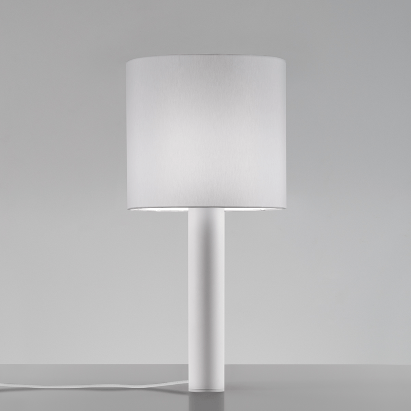 abajur de mesa com base alongada em alumínio pintado e cúpula em tecido branco, a luminária de mesa raw oferece uma iluminação difusa e agradável, ideal para salas de estar e dormitórios.