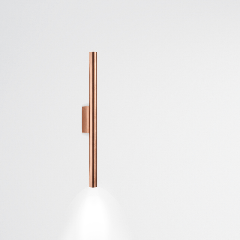 arandela em cobre, com um facho - direto e/ou indireto - podendo ser usada individualmente ou em composição. ideal para uma iluminação suave e pontual.