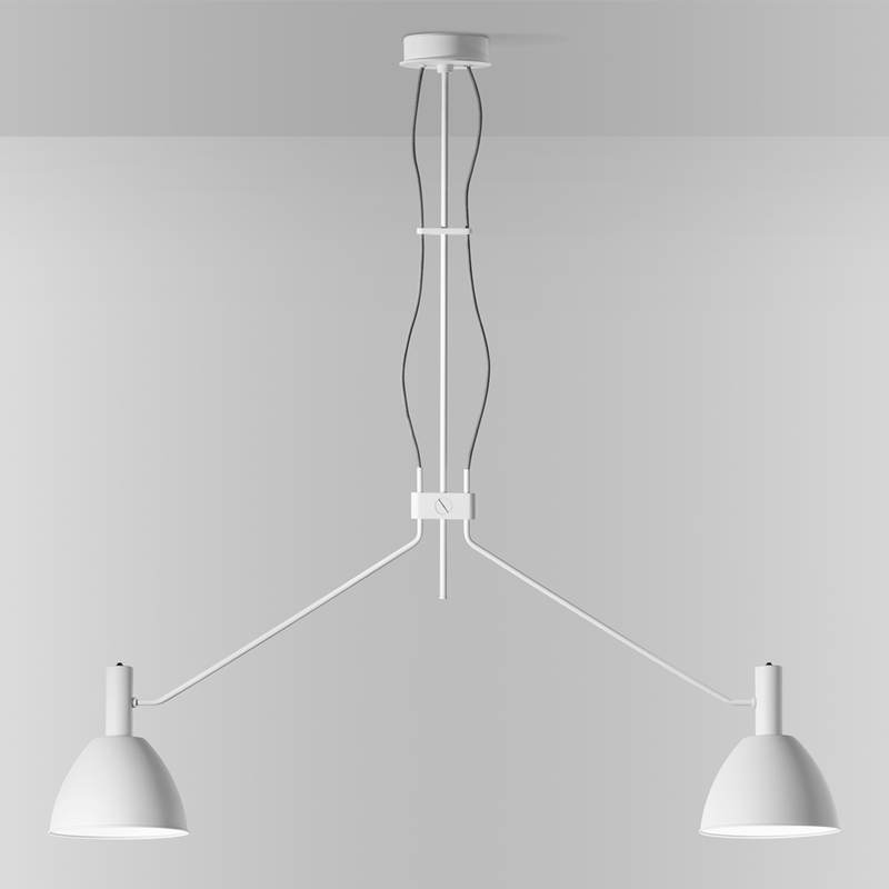 pendente de haste rígida com regulagem de altura e dois difusores orientáveis, possibilitando diferentes efeitos de iluminação.