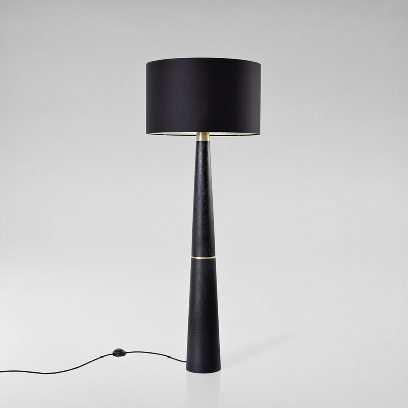 luminária de piso com linguagem casual e sofisticada, baju possui base em madeira ebanizada e cúpula em linho preto. oferece uma iluminação difusa e confortável, adequada a diversos tipos de ambientes. na versão dimerizável, permite o controle da intensidade da luz, sem perder a eficiência.