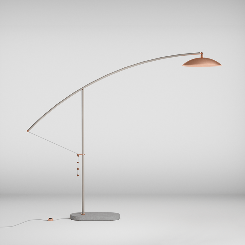 com desenho de claudia moreira salles para a lumini, tirante é uma luminária de piso com regulagem de altura da cúpula através da movimentação do braço, e que permite travamento em 4 diferentes posições através de delicadas esferas de madeira. com base em concreto, haste e braço em alumínio pintado, cúpula e detalhes em cobre, latão ou verde índico, e sistema de travamento em corda e madeira, tirante materializa-se a partir de diferentes materiais para cada uma de suas funções. possui conjunto óptico bastante sofisticado proporcionando grande abertura do facho e excelente controle de ofuscamento. ideal para ambientes com pé direito duplo ou mesas de jantar onde não existe ponto de iluminação no teto.