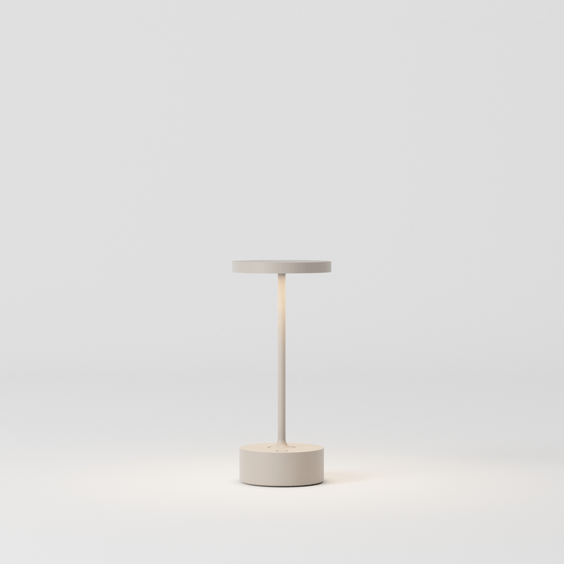 luminária portátil de mesa em alumínio pintado, com desenho discreto e minimalista, e luz direta e agradável, compõe diversos ambientes. em mesas de jantar, sua cúpula produz mínima interferência visual. possui bateria recarregável de alta autonomia e permite o controle de intensidade de luz e três níveis de temperatura de cor diferentes (1800k - 2700k).