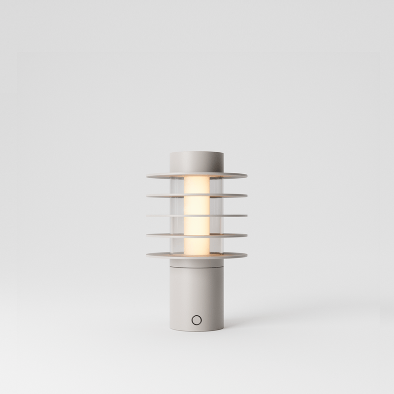 remetendo às luzes posicionadas nas popas dos barcos, a luminária portátil vista, de lia siqueira para lumini, se origina de uma conexão com o oceano, e evoca uma atmosfera marítima.