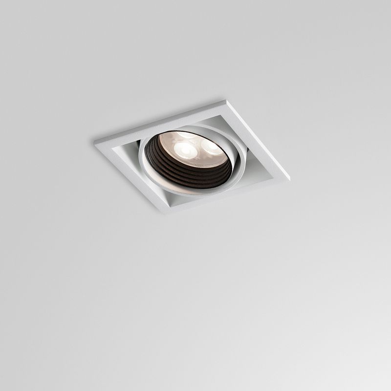 luminária embutida quadrada orientável em alumínio, com sistema óptico com dispositivo antiofuscamento na cor preta e fixação por meio de molas em aço inox.