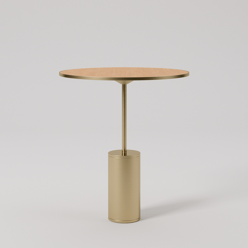 produzida em latão, a mesinha wish se aproveita do desenho da base da luminária de mesmo nome para criar uma nova função. disponível em duas alturas, possui tampo revestido com lâmina natural de madeira carvalho americano e é ideal para compor diferentes tipos de ambientes.